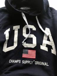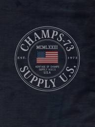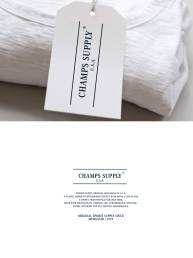 Line sheets for the full collection including color cards, and print designs with placement artwork. design of name and logo for Champs Supply .Graphic design for labelling system including executions of woven labels, neck prints, hangtags, and packaging design.